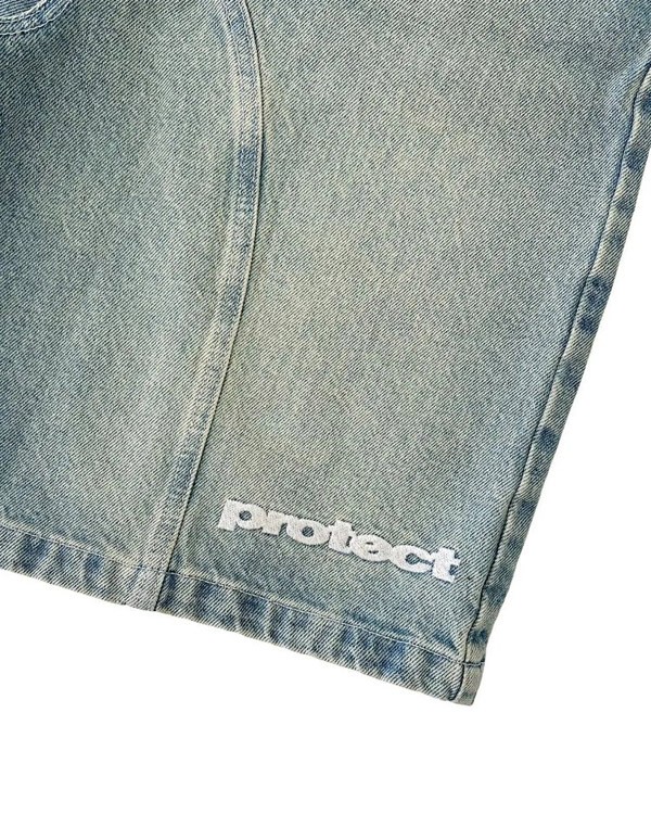 Protect Embroidered Loose Harajuku Washed Denim Shorts-4926